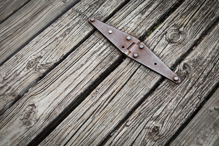 Vintage rusted metal door hinge over the weathered wooden wall.