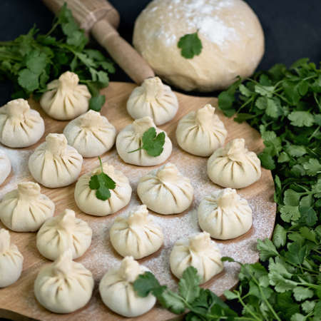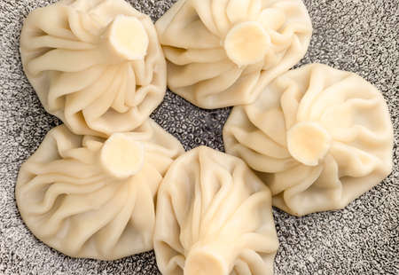 National Georgian cuisine. Raw Khinkali with meat. Khinkali on a board. Top view.