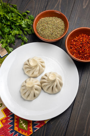 Close up to Caucasian khinkali dumplings dish served on plate. Background with ingredients and scattered spices. Forks near the dish