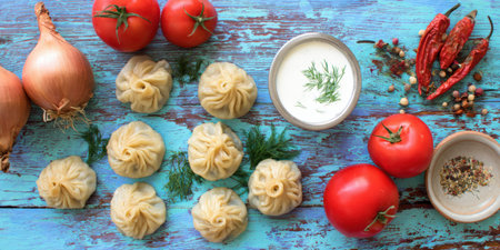Platter presenting traditional oriental steamed dumplings or momos with fresh vegetables, onions, tomatoes, chili peppers, dill, and various spices on a vibrant rustic wooden table