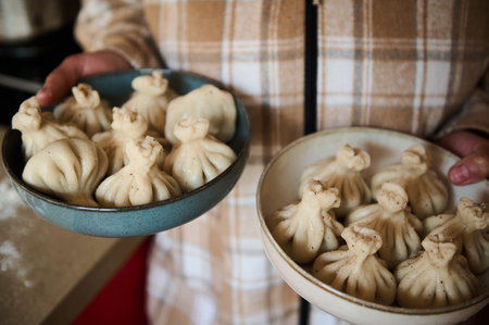 Chef skillfully prepares a traditional Georgian dumpling, demonstrating the intricate process of filling and pleating the dough. Chef preparing dumpling: a culinary masterpiece