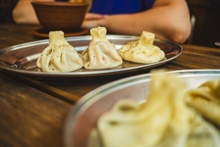 Delicious khinkali traditional Georgian dumplings filled with meat are beautifully arranged on a metal platter garnished with spices in a warm dining setting