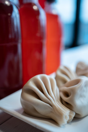 set of georgian khinkali with homemade red wine or chacha in plastic bottles