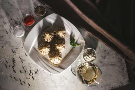 Fresh hot khinkali dumplings. Traditional Georgian dumplings with meat. Georgian food