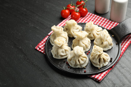 Delicious khinkali served on black table, above view. Space for text