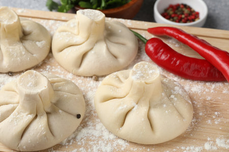 Uncooked khinkalis (dumplings) and chili pepper on table, closeup