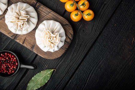 Uzbek Manti. Manti or manty dumplings, popular uzbek-asian dish set, on black wooden table background, top view flat lay, with copy space for text