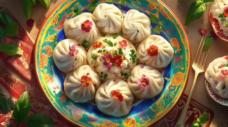 A vibrant display of dumplings arranged on a colorful plate, garnished with edible flowers and fresh herbs, showcasing culinary artistry and tradition.