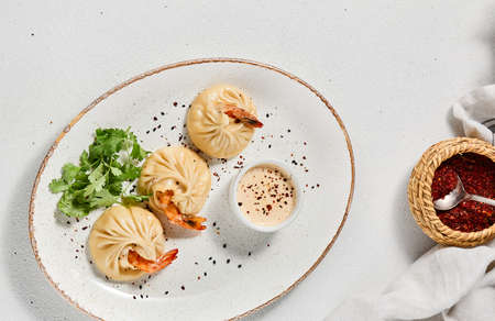 Steamed dumplings shrimp in asian style on white concrete background. Prawn dim sum with sauce on ceramic plate. Shrimp wontons on dish in minimal style. Asian dumplings with seafood