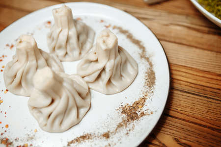 Georgian traditional food khinkali on the plate in restaurant, ready to eat, hot dish on the wooden table.