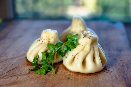 Georgian homemade food called khinkali on wooden board