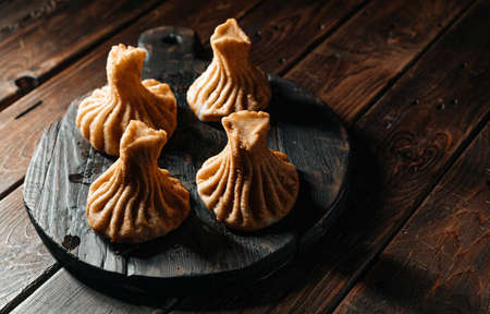 Georgian fried khinkali dumplings with meat on a wooden plank. A traditional dish of Caucasian cuisine.