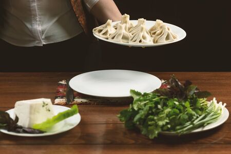 Waiter brings a plate of khinkali.Georgian cuisine.khinkali with on white plate