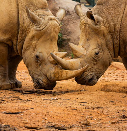 Two Rhino Locking Horns Close to the Ground