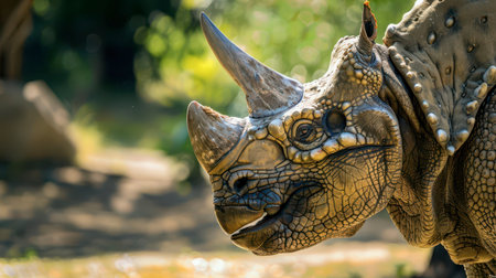 A lifelike dinosaur model with prominent horns is surrounded by vibrant green foliage under soft natural light creating a prehistoric atmosphere.