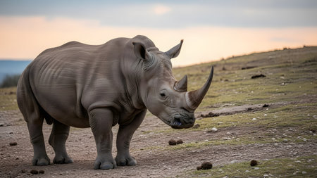 A rhinoceros walking along a grassy hillside with a soft, warm sky in the background, likely at dusk. The low angle emphasizes the animal's size and the peacefulness of the wild environment.