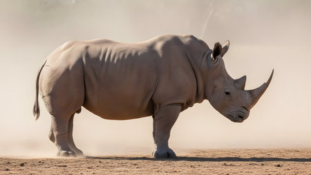 A large white rhinoceros stands in side profile against a hazy, dusty beige background. The image captures the rugged texture of the animal's skin, its heavy build, and prominent horn in a wild savanna environment.