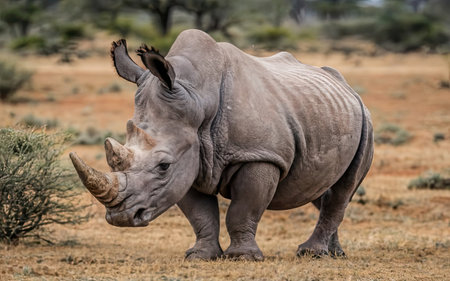 A closeup of an african rhino grazing in the savannah, its powerful horns and thick skin visible as it snatches grass. documentary photography, photography