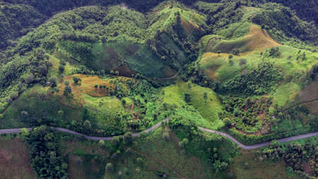 Top view of countryside road passing through the green forrest and mountain