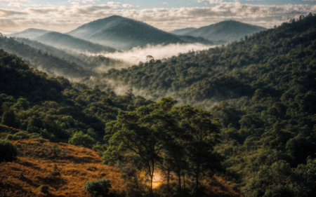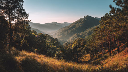 Misty Mountain Sunrise: Serene Landscape of Rolling Hills and Forested Valley