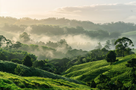 A serene morning scene as mist weaves through the lush green rolling hills, enhancing the tranquil and picturesque landscape.