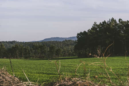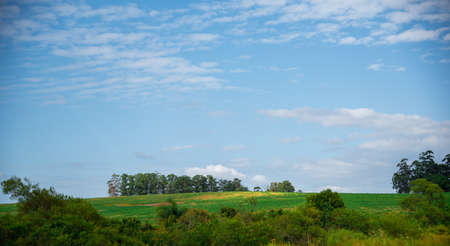 farm area in southern brazil in contrast to the blue sky horizon. Countryside interior on the border of Brazil and Argentina. Landscape of the pampa biome.