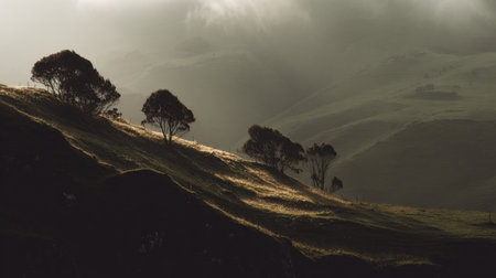 A breathtaking landscape featuring rolling hills and silhouetted trees against dramatic skies. The interplay of light and shadow creates a serene and tranquil atmosphere.