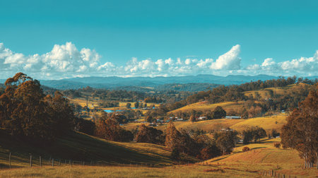 Explore a picturesque countryside scene featuring rolling green hills under a clear blue sky, adorned with fluffy clouds and distant mountains, symbolizing tranquility.