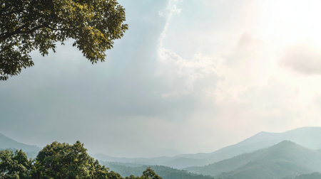 Captivating mountain landscape under an expansive sky, showcasing lush greenery in the foreground and soft clouds that evoke a sense of tranquility and peace.