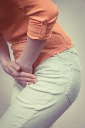 Close-up view of a young woman with pain in kidneys on gray background. Young woman with back ache clasping her hand to her lower back. Woman suffering from ribbing pain, waist pain. Body Concept.