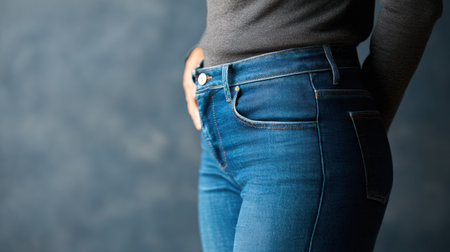 Closeup of female plus size hips buttocks wearing blue jeans, woman presenting fashionable outfit. Fashion clothing femininity concept. Gray background