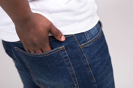 black man keeping hand in pocket. guy wearing white t-shirt and blue jeans