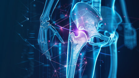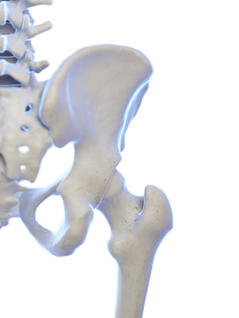 A digital illustration of the human hip joint, showcasing the ball-and-socket structure and range of motion in the hip region.