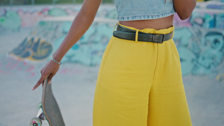 Skater hands holding skateboard outdoors close up. Unrecognizable african american girl skateboarder wearing yellow pants playing with modern longboard in skate park. Extreme street hobby concept.
