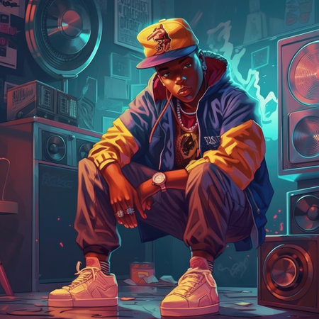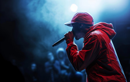 African rapper on stage rap, dynamic pose, hero angle, AI generative illustration