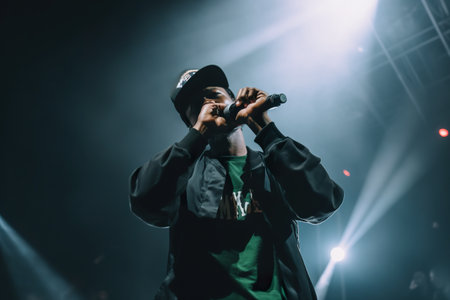 Energetic male rap artist in spotlight with smoke and lights, capturing power, presence, and live concert vibes.