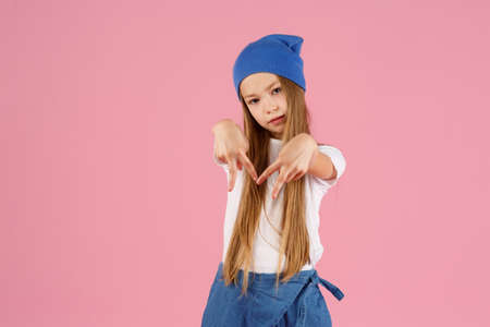 A little girl of 7 years in a white shirt on a pink background, emotions of joy and happiness. copy space.