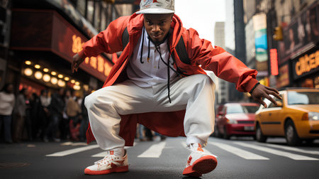 Hip hop dancer performing in New York City, wearing a red jacket and white pants.