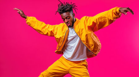 A dancer showcases impressive moves, wearing a bright yellow outfit, amidst a striking pink background, capturing a moment of joy and expression in urban dance culture.