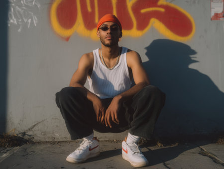 Young black man squatting against a graffiti wall at golden hour, wearing an orange durag, sunglasses, white tank and baggy pants, projecting cool confidence and street style