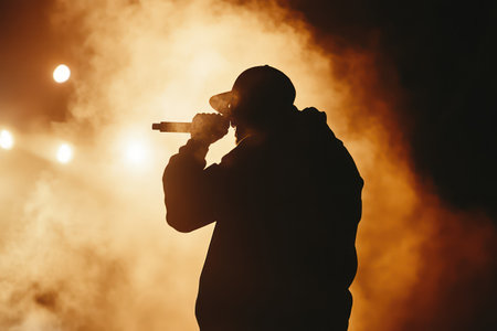 A silhouette of singer rap musician during live concert in dark light. Dark background, smoke, spotlights