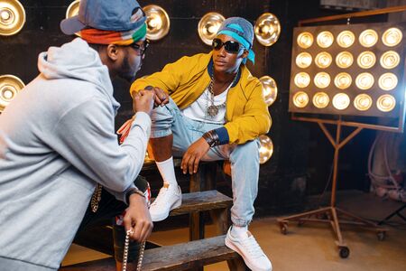 Black rappers in sunglasses, perfomance on stage