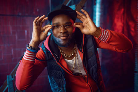 Rapper in stylish gold glasses posing in studio