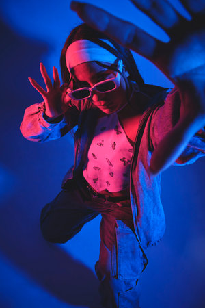 Hipster dancer fashion professional man in fashionable clothes dancing in creative colorful studio with pink and blue light