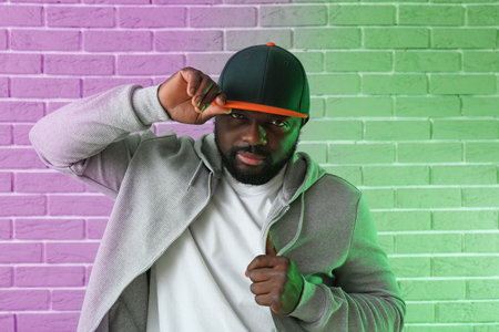 Handsome african american man in cap and jacket standing near graffiti wall