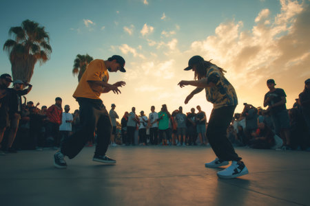 Two breakdancers are performing a freestyle dance battle during a street dance competition at sunset, surrounded by a cheering crowd