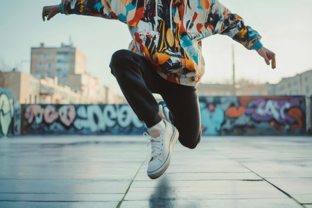 Street dancer in motion, face hidden by a dynamic pose, urban graffiti wall background, vibrant street wear, strong contrasts, energetic movement capture, urban youth culture vibe
