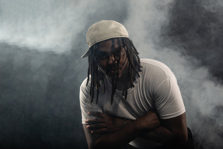 man with dreadlocks wearing a hat and white shirt posing for the camera in a studio against a smoky background. Confident and serious young man.