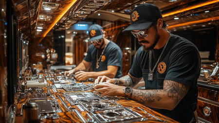 Unidentified tattooed men working with electronic components in a shipyard.