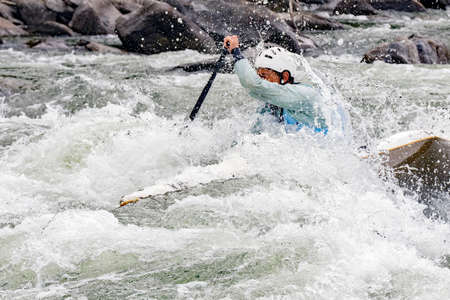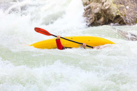 a rower on a kayak goes along a mountain river. dangerous active rest on the river. overcoming difficulties